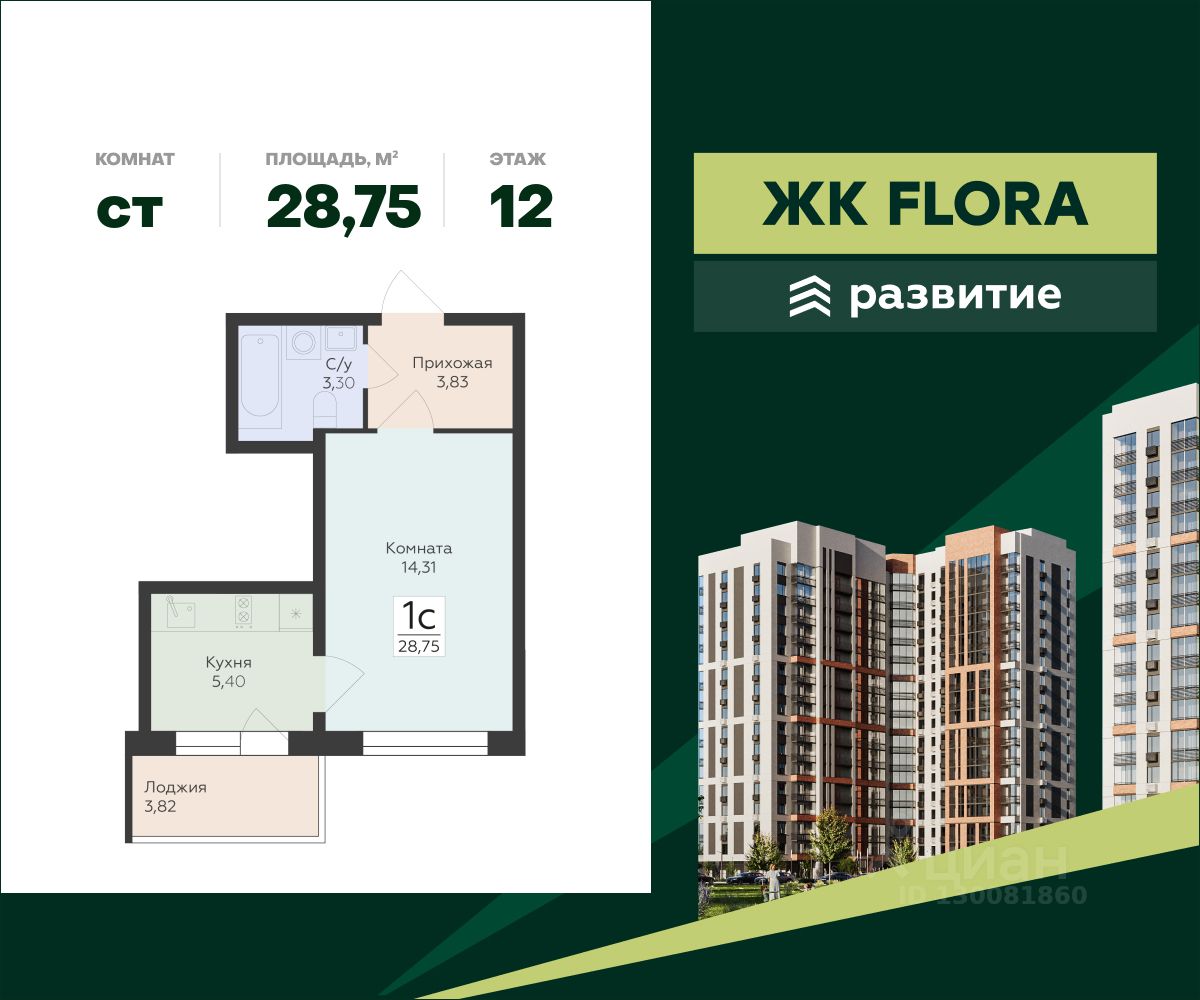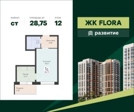 В продаже квартира площадью 28.75 кв. м с черновой отделкой. Квартира расположена на 12 этаже 17 этажного дома, в жилом комплексе комфорт-класса FLORA ("Флора").