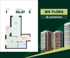 В продаже квартира площадью 35.37 кв. м с черновой отделкой. Квартира расположена на 2 этаже 15 этажного дома, в жилом комплексе комфорт-класса FLORA ("Флора").