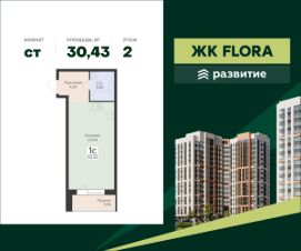 В продаже квартира площадью 30.43 кв. м с черновой отделкой. Квартира расположена на 2 этаже 16 этажного дома, в жилом комплексе комфорт-класса FLORA ("Флора").