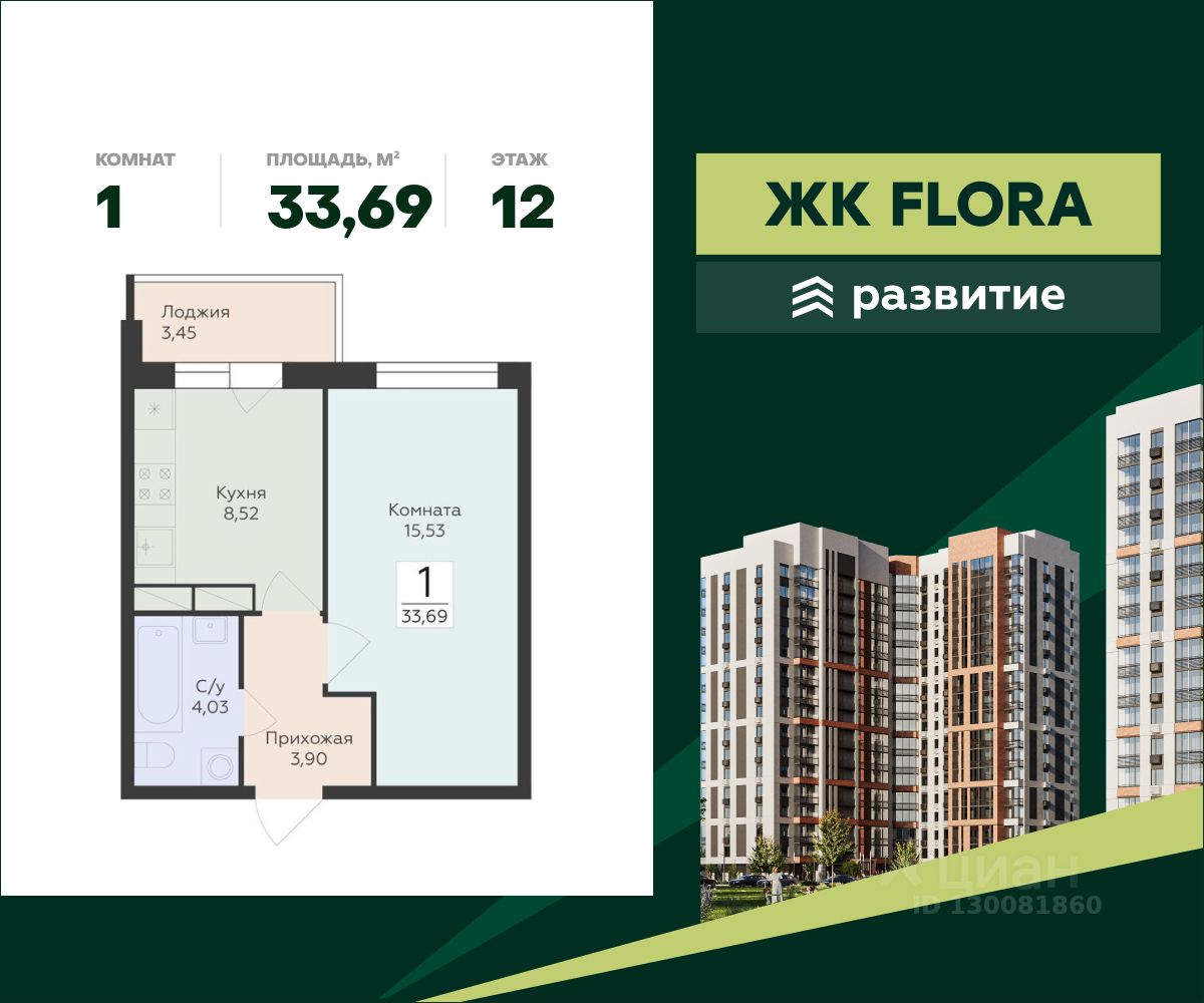 В продаже квартира площадью 33.69 кв. м с черновой отделкой. Квартира расположена на 12 этаже 15 этажного дома, в жилом комплексе комфорт-класса FLORA ("Флора").