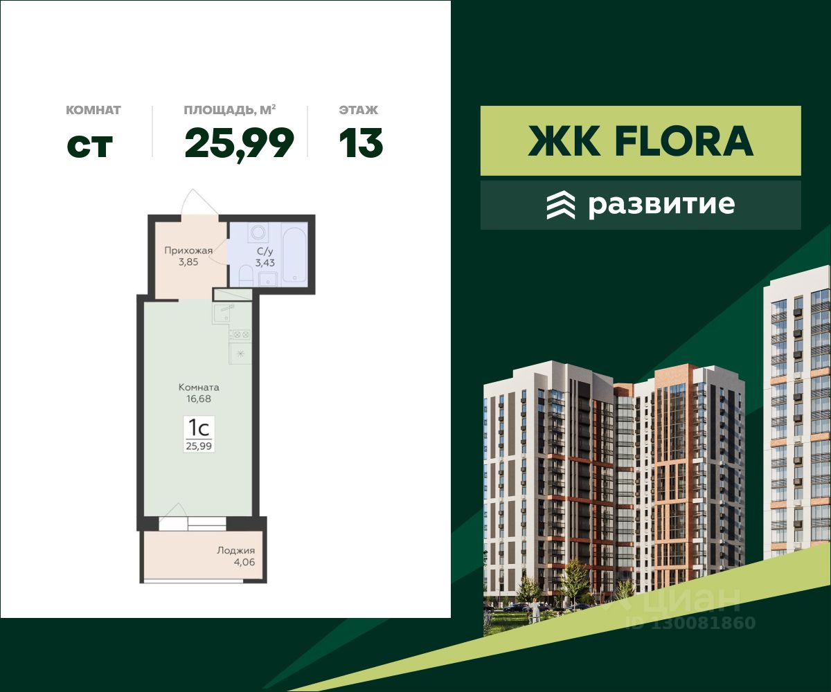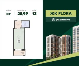 В продаже квартира площадью 25.99 кв. м с черновой отделкой. Квартира расположена на 13 этаже 15 этажного дома, в жилом комплексе комфорт-класса FLORA ("Флора").