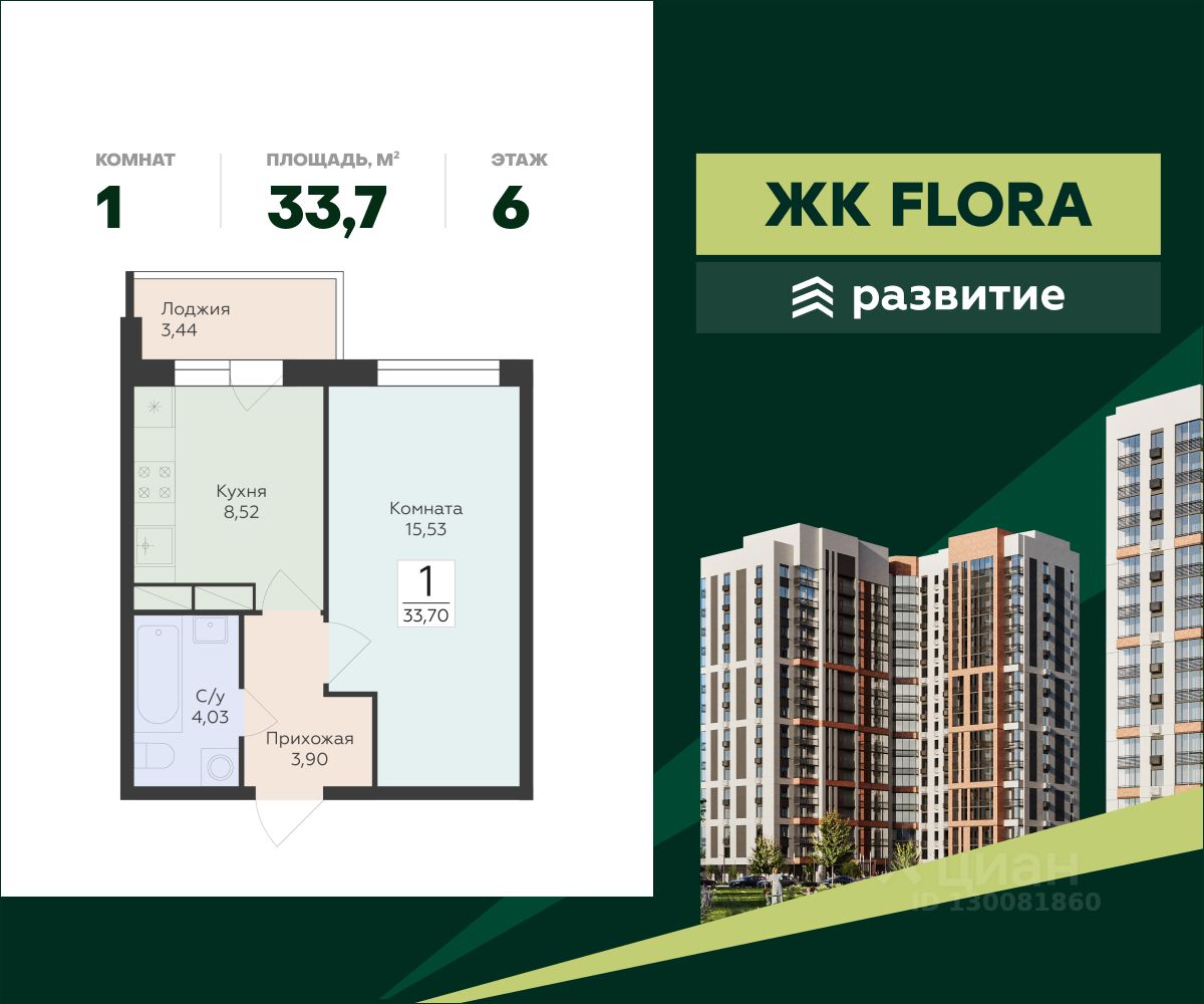 В продаже квартира площадью 33.70 кв. м с черновой отделкой. Квартира расположена на 6 этаже 15 этажного дома, в жилом комплексе комфорт-класса FLORA ("Флора").