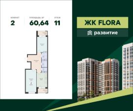 В продаже квартира площадью 60.64 кв. м с черновой отделкой. Квартира расположена на 11 этаже 15 этажного дома, в жилом комплексе комфорт-класса FLORA ("Флора").