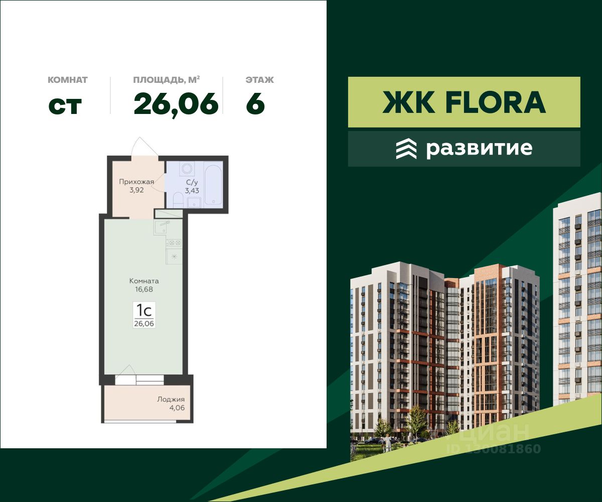 В продаже квартира площадью 26.06 кв. м с черновой отделкой. Квартира расположена на 6 этаже 15 этажного дома, в жилом комплексе комфорт-класса FLORA ("Флора").