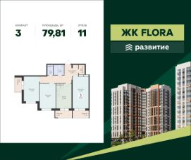 В продаже квартира площадью 79.81 кв. м с черновой отделкой. Квартира расположена на 11 этаже 15 этажного дома, в жилом комплексе комфорт-класса FLORA ("Флора").