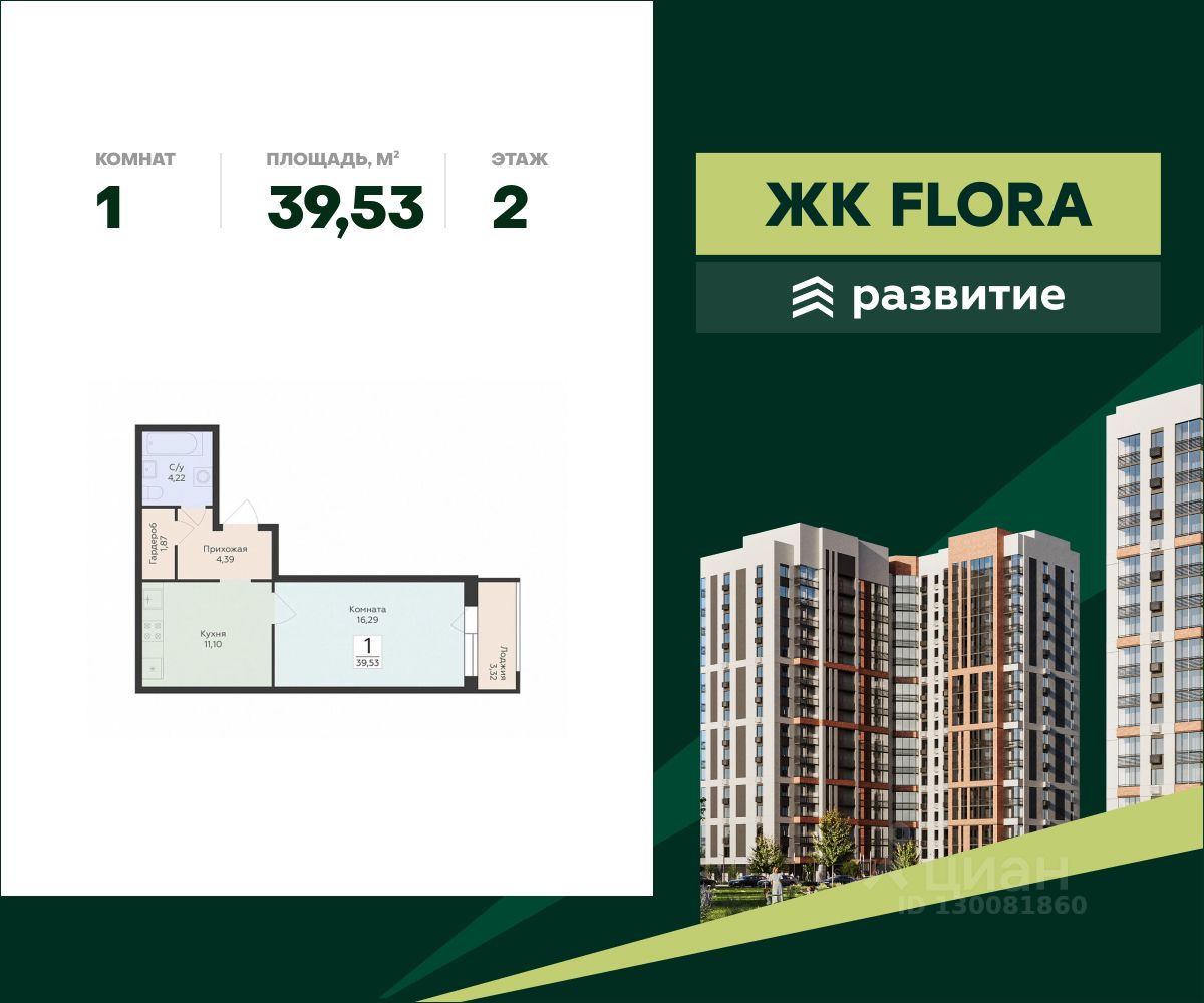 В продаже квартира площадью 39.53 кв. м с черновой отделкой. Квартира расположена на 2 этаже 17 этажного дома, в жилом комплексе комфорт-класса FLORA ("Флора").