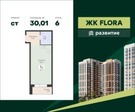 В продаже квартира площадью 30.01 кв. м с черновой отделкой. Квартира расположена на 6 этаже 16 этажного дома, в жилом комплексе комфорт-класса FLORA ("Флора").