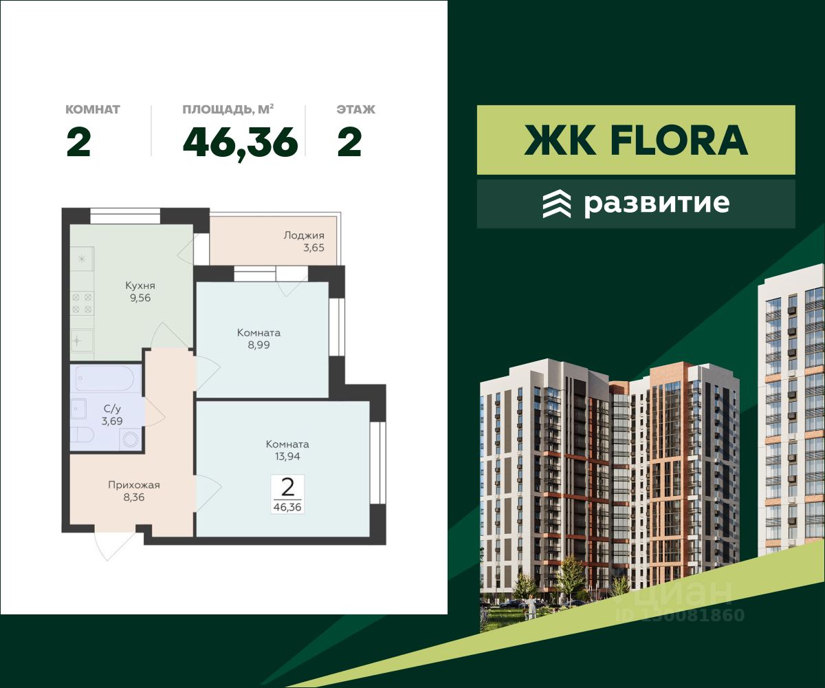 В продаже квартира площадью 46.36 кв. м с черновой отделкой. Квартира расположена на 2 этаже 17 этажного дома, в жилом комплексе комфорт-класса FLORA ("Флора").