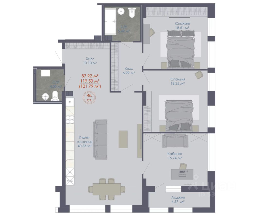 Продаётся 4-комнатная квартира в строящемся доме (Дом 1), срок сдачи: IV-кв. 2025, общей площадью 122.18 кв.м., на 20 этаже. Новый жилой комплекс "48" от группы компаний "Семья" расположен по адресу: г. Воронеж, по ул. пр-кт Труда.