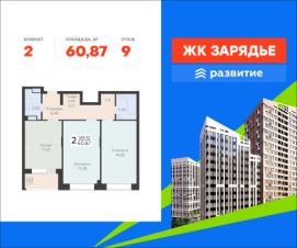 В продаже квартира площадью 60.87 кв. м с черновой отделкой. Квартира расположена на 9 этаже 13 этажного дома, в новом микрорайоне комфорт-класса "Зарядье" (Девелопер - ГК "Развитие").