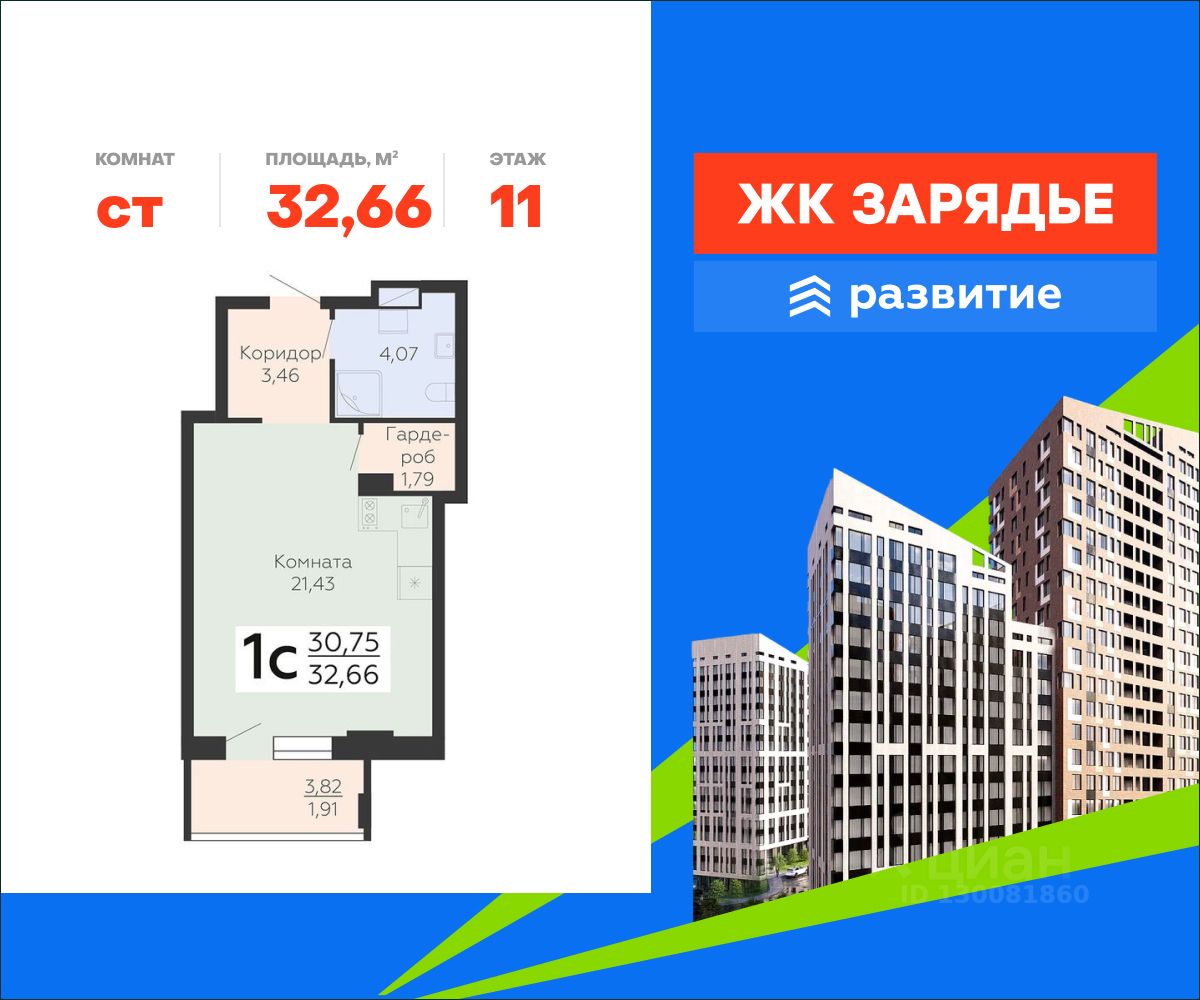 В продаже квартира площадью 32.66 кв. м с черновой отделкой. Квартира расположена на 11 этаже 23 этажного дома, в новом микрорайоне комфорт-класса "Зарядье" (Девелопер - федеральный застройщик ГК "Развитие").