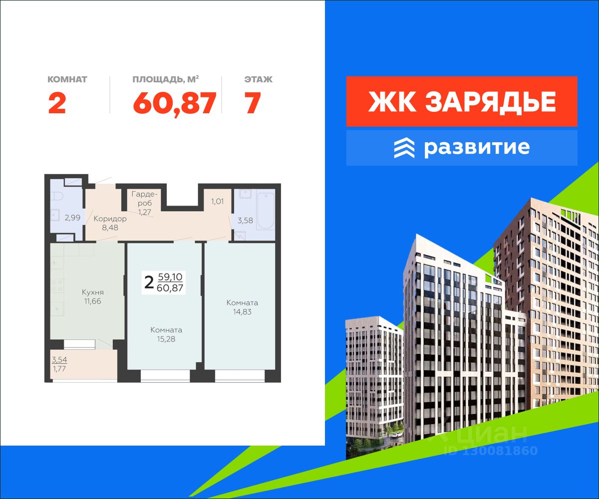 В продаже квартира площадью 60.87 кв. м с черновой отделкой. Квартира расположена на 7 этаже 13 этажного дома, в новом микрорайоне комфорт-класса "Зарядье" (Девелопер - федеральный застройщик ГК "Развитие").