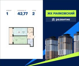 В продаже квартира площадью 42.77 кв. м с черновой отделкой. Квартира расположена на 2 этаже 21 этажного дома, в жилом комплексе "Маяковский" от ГК "Развитие".