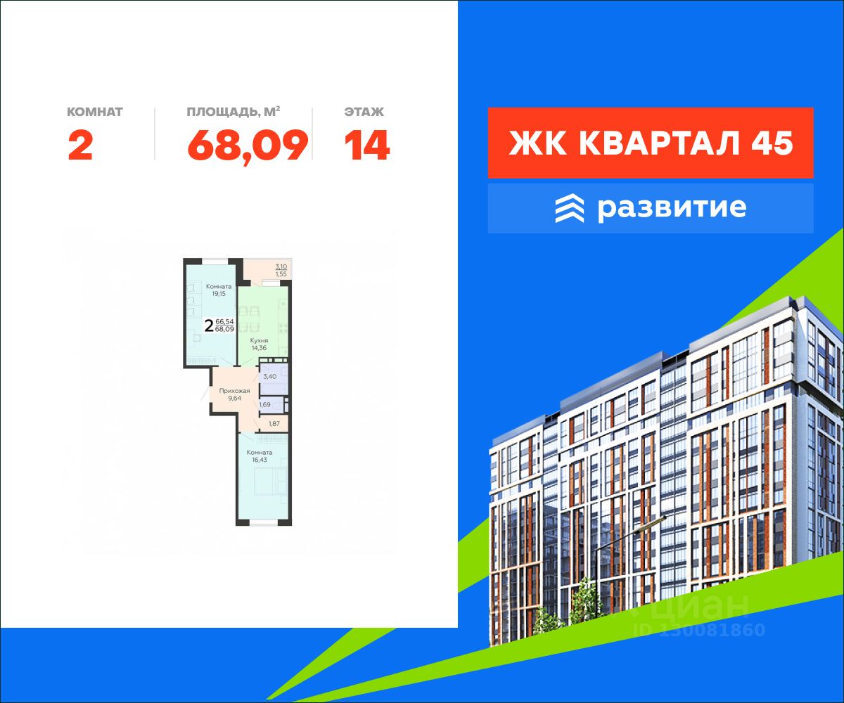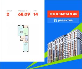 В продаже квартира площадью 68.09 кв. м с черновой отделкой. Квартира расположена на 14 этаже 18 этажного дома, в жилом комплексе комфорт-класса "Квартал 45".