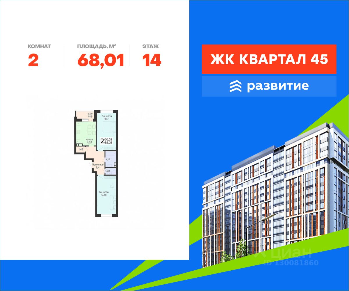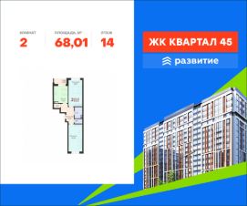 В продаже квартира площадью 68.01 кв. м с черновой отделкой. Квартира расположена на 14 этаже 18 этажного дома, в жилом комплексе комфорт-класса "Квартал 45".