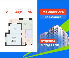 В продаже квартира площадью 47.11 кв. м с черновой отделкой. Квартира расположена на 16 этаже 18 этажного дома, в новом жилом квартале "Авиапарк".