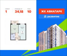 В продаже квартира площадью 34.18 кв. м с черновой отделкой. Квартира расположена на 10 этаже 18 этажного дома, в новом жилом квартале "Авиапарк".