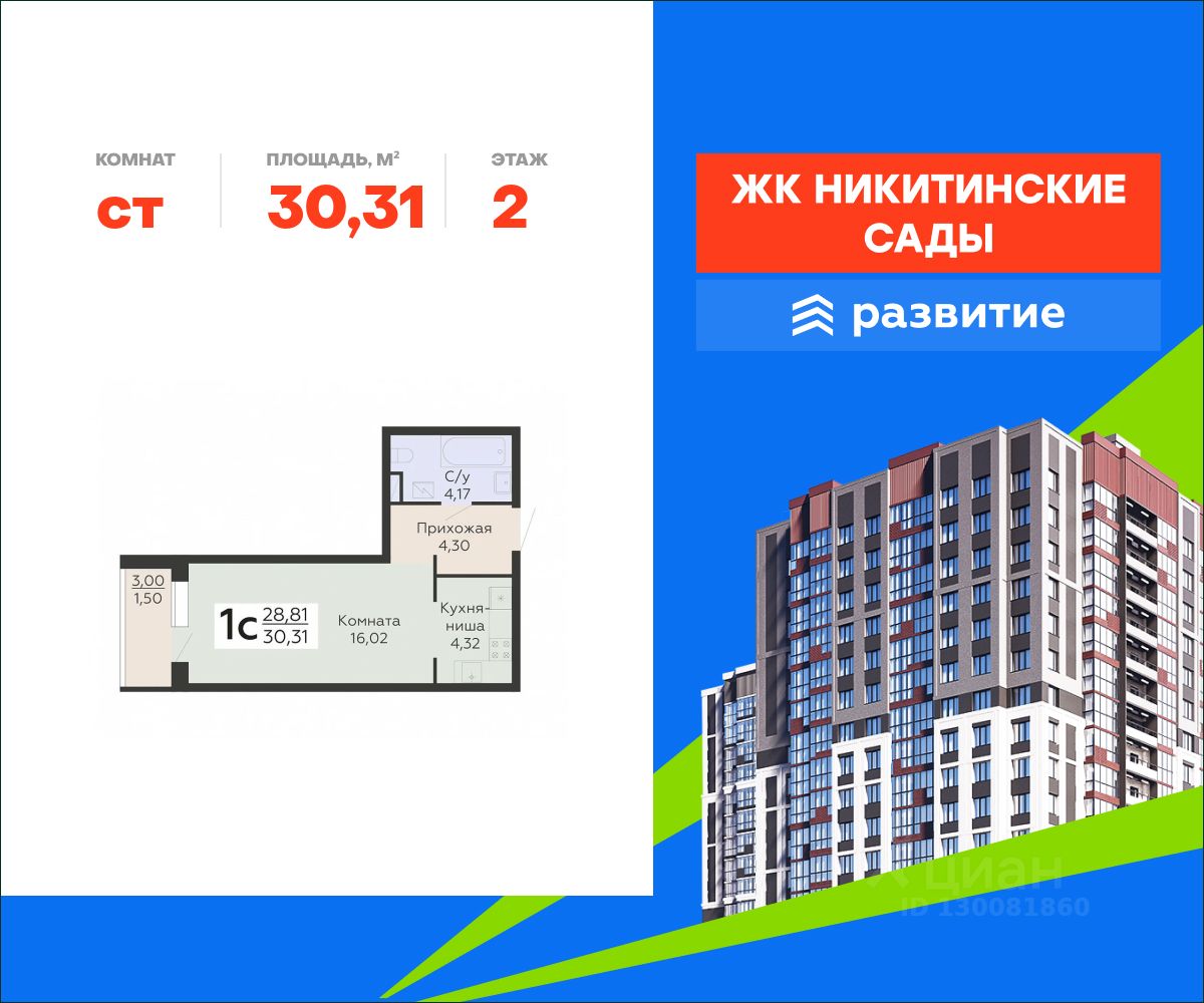В продаже квартира площадью 30.31 кв. м с черновой отделкой. Квартира расположена на 2 этаже 20 этажного дома, в жилом комплексе комфорт-класса "Никитинские сады".