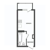 Квартира с совмещенным санузлом общей площадью 18,8 кв.м., жилая площадь 11,4 кв.м, лоджия 1,7 кв.м.