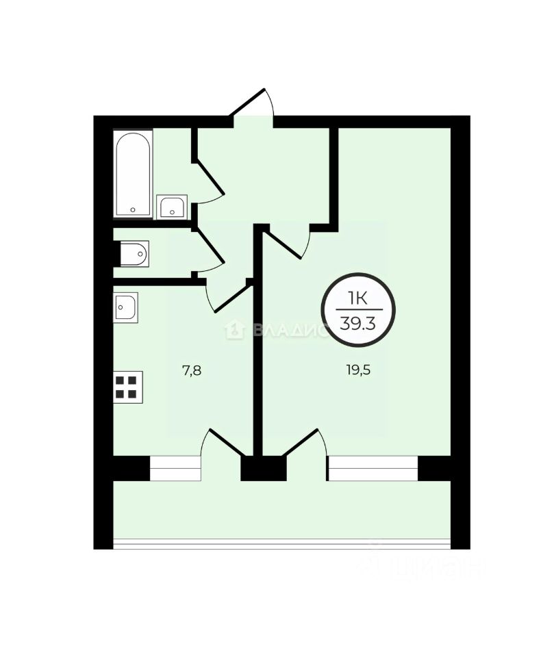 Однокомнатная квартира общей площадью 39,3 кв. м на 5-м этаже девятиэтажного кирпичного дома 1982 года постройки. Жилая площадь 19,5 кв. м, кухня — 7,8 кв. м. Высота потолков 2,7 м создаёт ощущение простора.