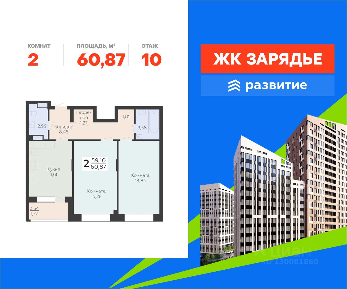 В продаже квартира площадью 60.87 кв. м с черновой отделкой. Квартира расположена на 10 этаже 13 этажного дома, в новом микрорайоне комфорт-класса "Зарядье" (Девелопер - федеральный застройщик ГК "Развитие").