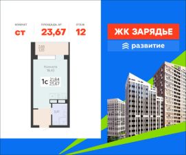 В продаже квартира площадью 23.67 кв. м с черновой отделкой. Квартира расположена на 12 этаже 13 этажного дома, в новом микрорайоне комфорт-класса "Зарядье" (Девелопер - федеральный застройщик ГК "Развитие").