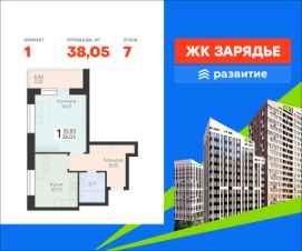 В продаже квартира площадью 38.05 кв. м с черновой отделкой. Квартира расположена на 7 этаже 25 этажного дома, в новом микрорайоне комфорт-класса "Зарядье" (Девелопер - федеральный застройщик ГК "Развитие").