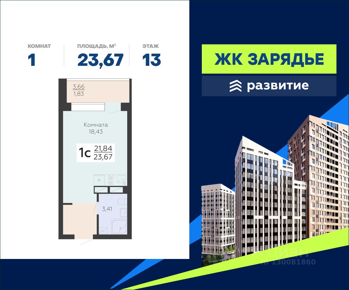 В продаже квартира площадью 23.67 кв. м с черновой отделкой. Квартира расположена на 13 этаже 13 этажного дома, в новом микрорайоне комфорт-класса "Зарядье" (Девелопер - ГК "Развитие").