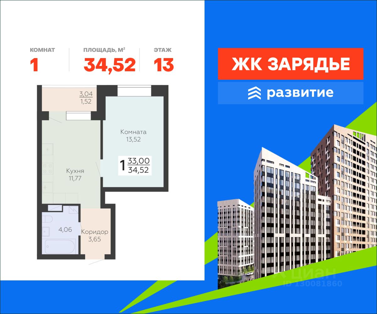 В продаже квартира площадью 34.52 кв. м с черновой отделкой. Квартира расположена на 13 этаже 13 этажного дома, в новом микрорайоне комфорт-класса "Зарядье" (Девелопер - федеральный застройщик ГК "Развитие").