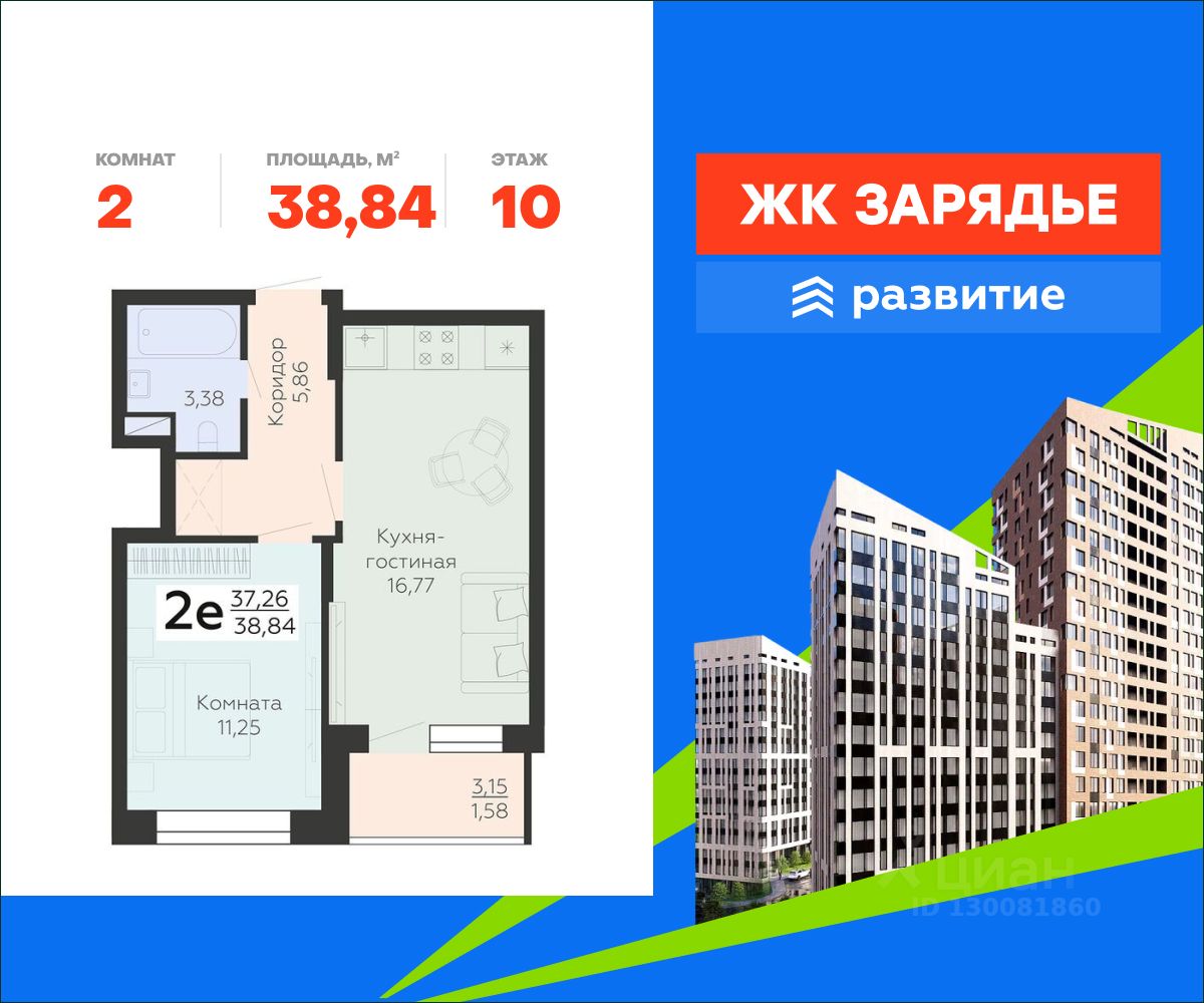 В продаже квартира площадью 38.84 кв. м с черновой отделкой. Квартира расположена на 10 этаже 25 этажного дома, в новом микрорайоне комфорт-класса "Зарядье" (Девелопер - федеральный застройщик ГК "Развитие").