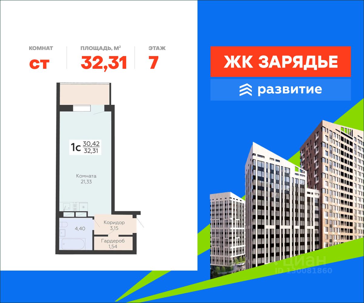 В продаже квартира площадью 32.31 кв. м с черновой отделкой. Квартира расположена на 7 этаже 13 этажного дома, в новом микрорайоне комфорт-класса "Зарядье" (Девелопер - федеральный застройщик ГК "Развитие").