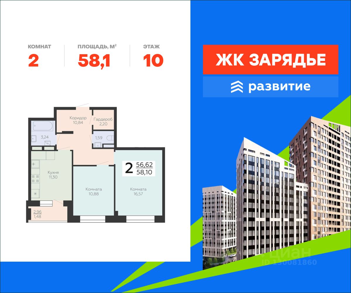 В продаже квартира площадью 58.10 кв. м с отделкой. Квартира расположена на 10 этаже 16 этажного дома, в новом микрорайоне комфорт-класса "Зарядье" (Девелопер - федеральный застройщик ГК "Развитие").