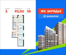 В продаже квартира площадью 92.02 кв. м с отделкой. Квартира расположена на 10 этаже 16 этажного дома, в новом микрорайоне комфорт-класса "Зарядье" (Девелопер - ГК "Развитие").
