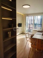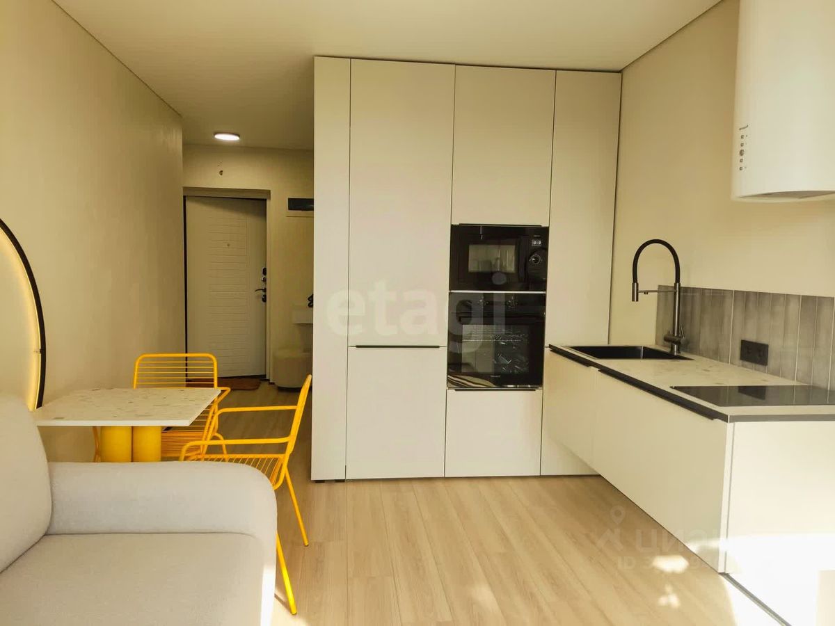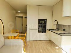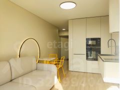 Планировочные решения продуманы до мелочей: потолки с теневой подсветкой, стены отделаны декоративной штукатуркой, кухонный гарнитур с парящими фасадами и скрытой подсветкой. В вечернее время теплый свет создает уютную атмосферу. Электрическая разводка выполнена по проекту — розетки расположены в удобных местах, включая умную розетку у кровати с управлением через Wi-Fi. Гостиная зона оборудована диваном с износостойкой обивкой и трансформирующимся механизмом, телевизором с функцией Smart TV и голосовым управлением.