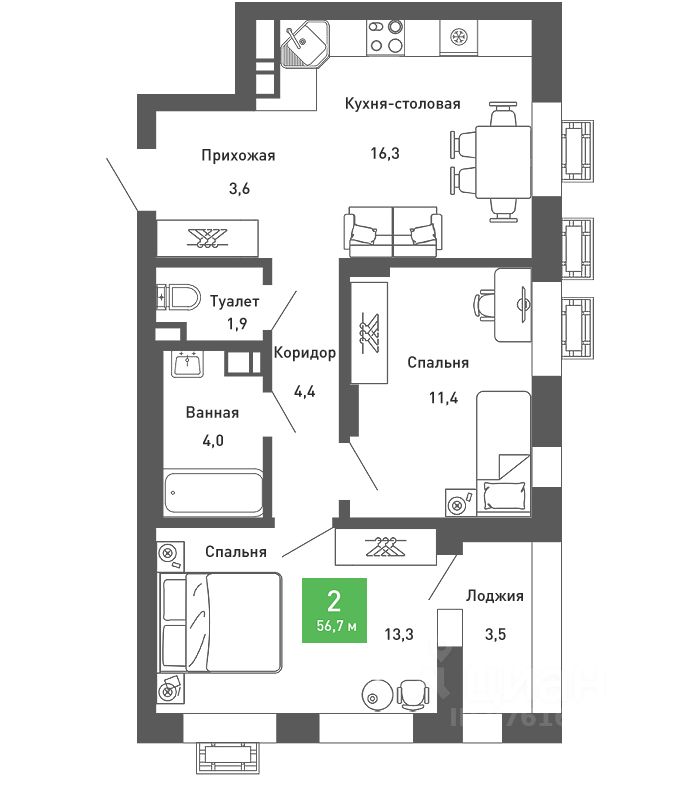 Продаётся 2-комнатная квартира в строящемся доме (3 этап), срок сдачи: III-кв. 2028, общей площадью 56.7 кв.м., на 2 этаже. ЖК "Ключи CLUB" - комплекс домов разной этажности (9-15 этажей), расположенный в одном из самых быстро развивающихся районов Воронеж. Поблизости есть несколько детских садов, школ, спортивных, досуговых и образовательных центров, поликлиника, магазины, салоны красоты. Объездная дорога и развитая транспортная сеть позволяет без пробок добраться в любую часть города в течение 15 минут.