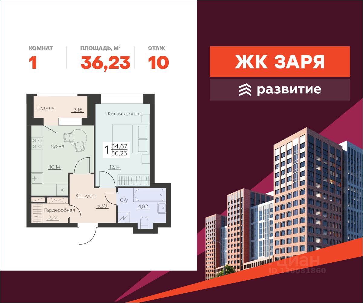 В продаже квартира площадью 36.23 кв. м с черновой отделкой. Квартира расположена на 10 этаже 14 этажного дома, в новом жилом комплексе "Заря" от федерального застройщика "Развитие".