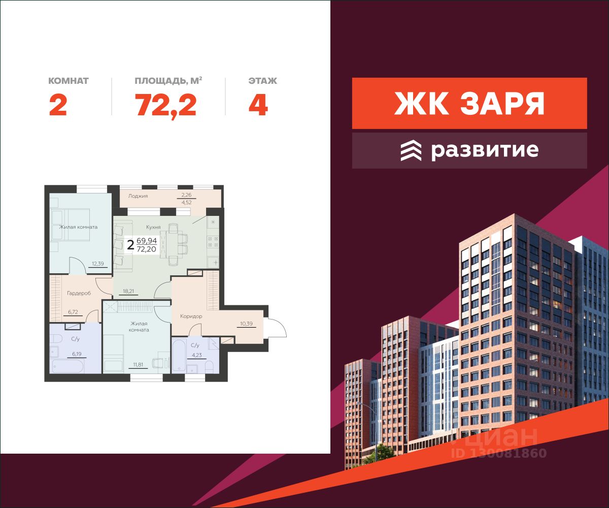 В продаже квартира площадью 72.20 кв. м с черновой отделкой. Квартира расположена на 4 этаже 12 этажного дома, в новом жилом комплексе "Заря" от федерального застройщика "Развитие".