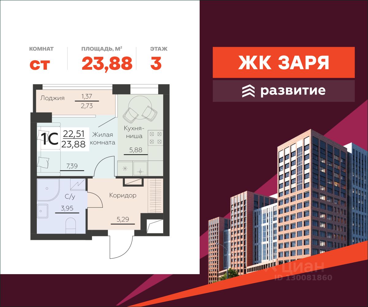 В продаже квартира площадью 23.88 кв. м с черновой отделкой. Квартира расположена на 3 этаже 12 этажного дома, в новом жилом комплексе "Заря" от федерального девелопера "Развитие".