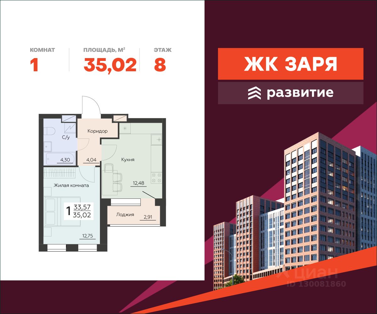 В продаже квартира площадью 35.02 кв. м с черновой отделкой. Квартира расположена на 8 этаже 16 этажного дома, в новом жилом комплексе "Заря" от федерального застройщика "Развитие".