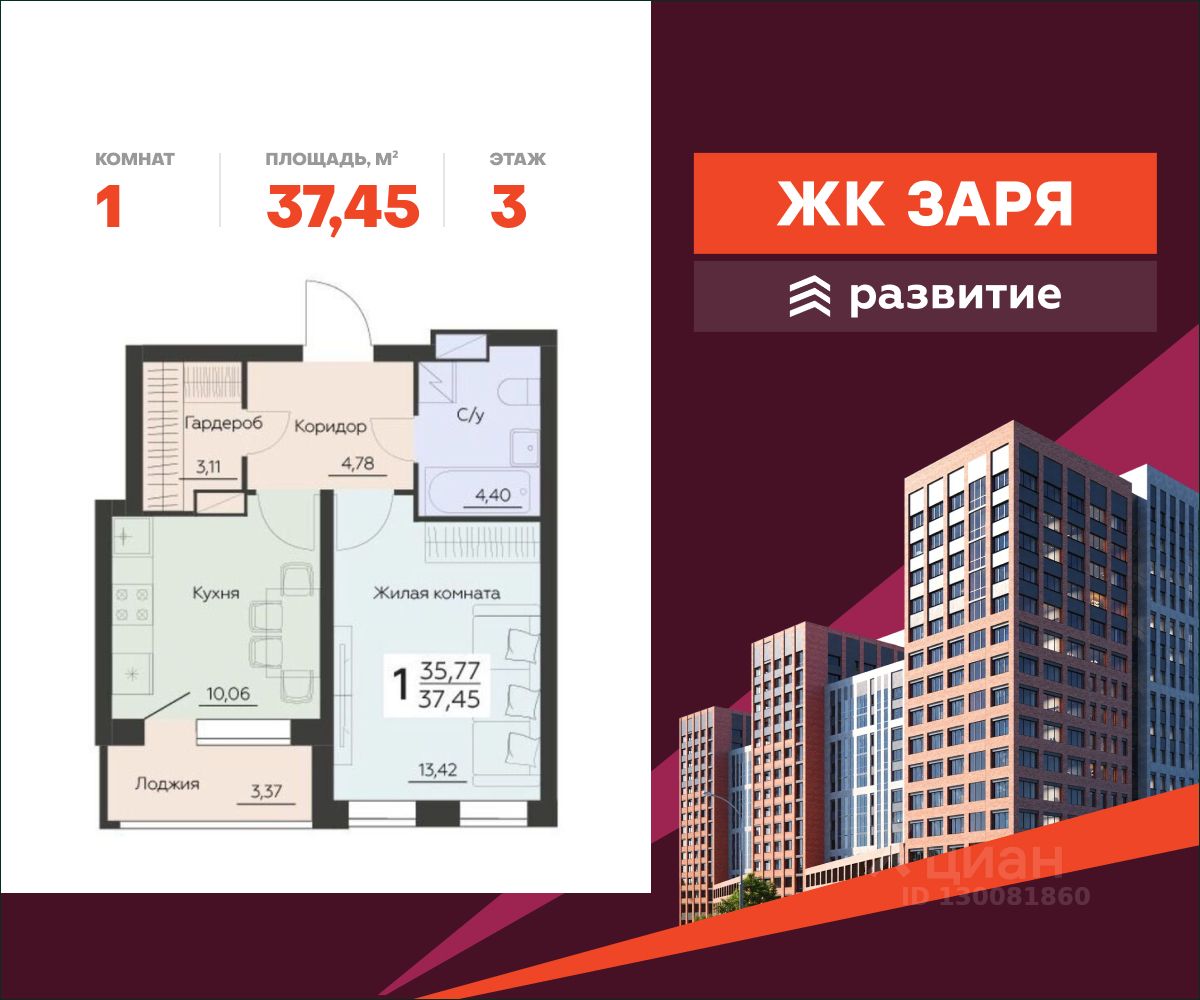 В продаже квартира площадью 37.45 кв. м с черновой отделкой. Квартира расположена на 3 этаже 16 этажного дома, в новом жилом комплексе "Заря" от федерального застройщика "Развитие".