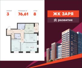 В продаже квартира площадью 76.61 кв. м с черновой отделкой. Квартира расположена на 8 этаже 14 этажного дома, в новом жилом комплексе "Заря" от федерального девелопера "Развитие".