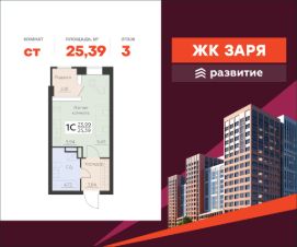 В продаже квартира площадью 25.39 кв. м с черновой отделкой. Квартира расположена на 3 этаже 10 этажного дома, в новом жилом комплексе "Заря" от федерального застройщика "Развитие".