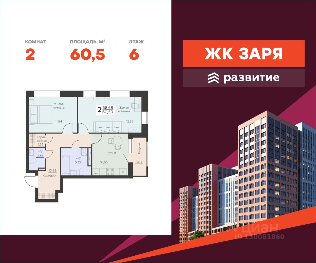 В продаже квартира площадью 60.50 кв. м с черновой отделкой. Квартира расположена на 6 этаже 14 этажного дома, в новом жилом комплексе "Заря" от федерального застройщика "Развитие".