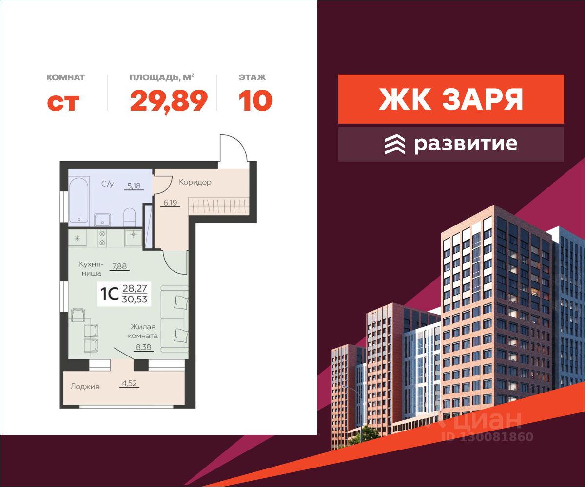 В продаже квартира площадью 29.89 кв. м с черновой отделкой. Квартира расположена на 10 этаже 14 этажного дома, в новом жилом комплексе "Заря" от федерального застройщика "Развитие".