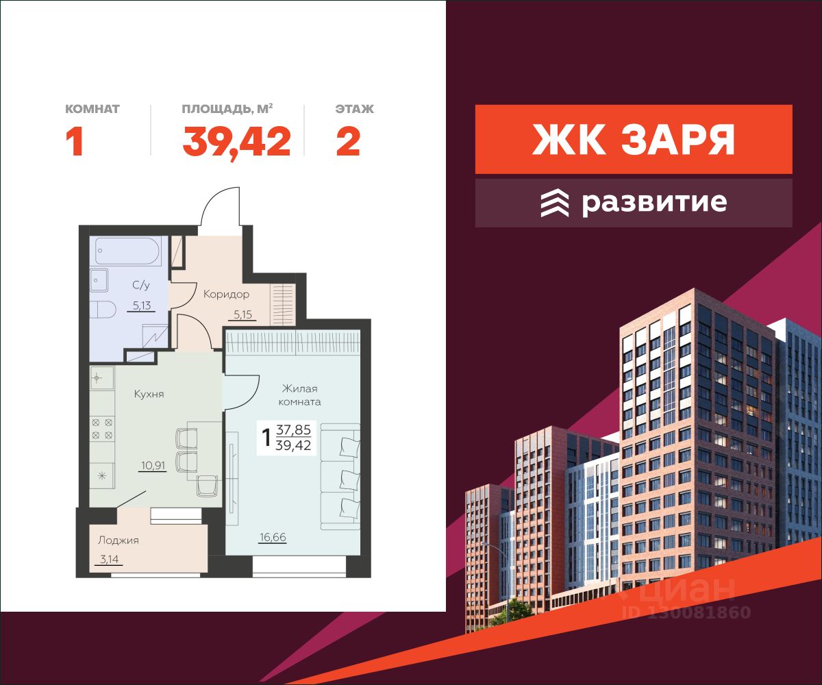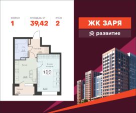 В продаже квартира площадью 39.42 кв. м с черновой отделкой. Квартира расположена на 2 этаже 14 этажного дома, в новом жилом комплексе "Заря" от федерального девелопера "Развитие".