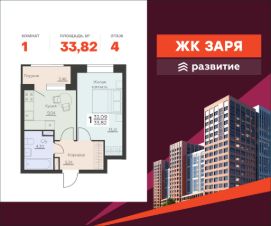 В продаже квартира площадью 33.82 кв. м с черновой отделкой. Квартира расположена на 4 этаже 14 этажного дома, в новом жилом комплексе "Заря" от федерального застройщика "Развитие".