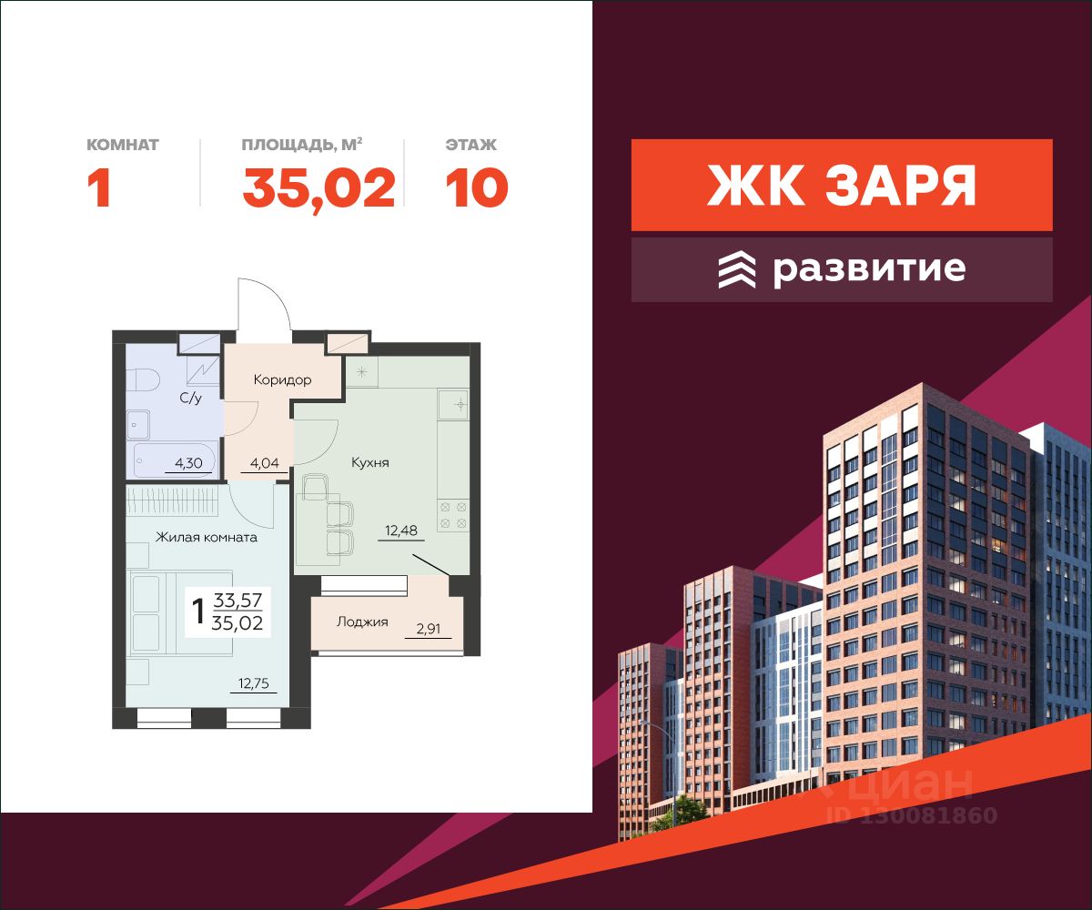 В продаже квартира площадью 35.02 кв. м с черновой отделкой. Квартира расположена на 10 этаже 16 этажного дома, в новом жилом комплексе "Заря" от федерального застройщика "Развитие".