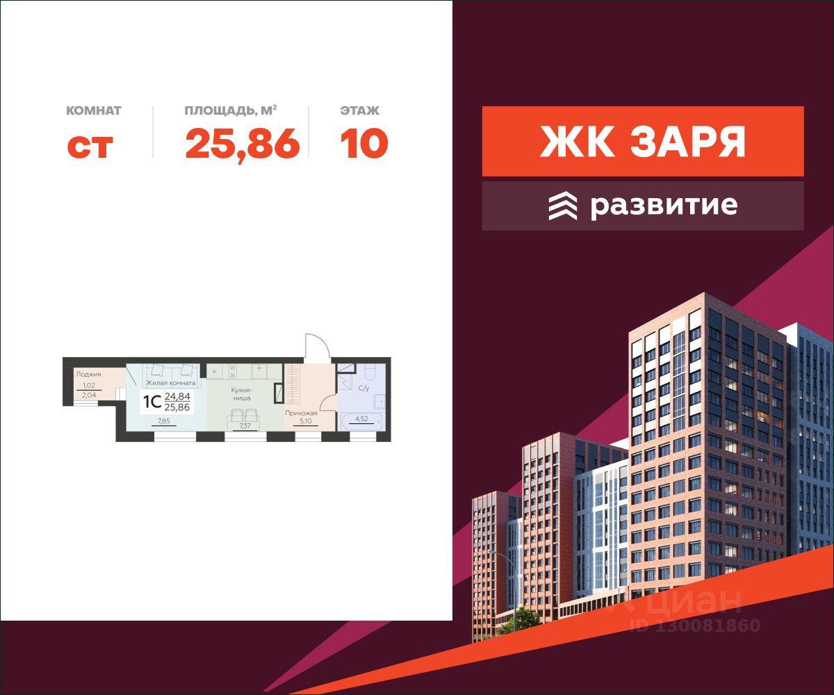 В продаже квартира площадью 25.86 кв. м с черновой отделкой. Квартира расположена на 10 этаже 12 этажного дома, в новом жилом комплексе "Заря" от федерального застройщика "Развитие".