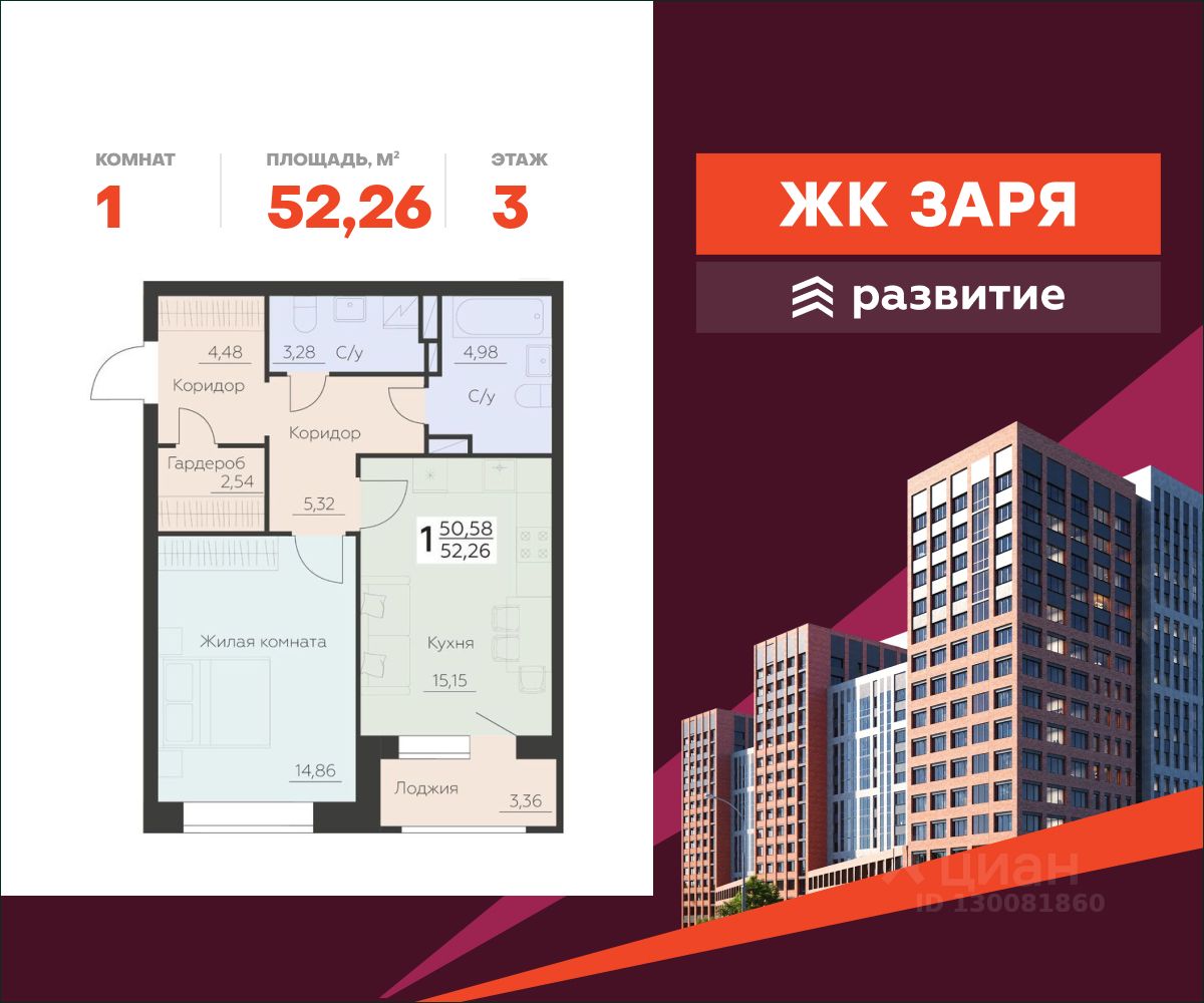 В продаже квартира площадью 52.26 кв. м с черновой отделкой. Квартира расположена на 3 этаже 10 этажного дома, в новом жилом комплексе "Заря" от федерального застройщика "Развитие".