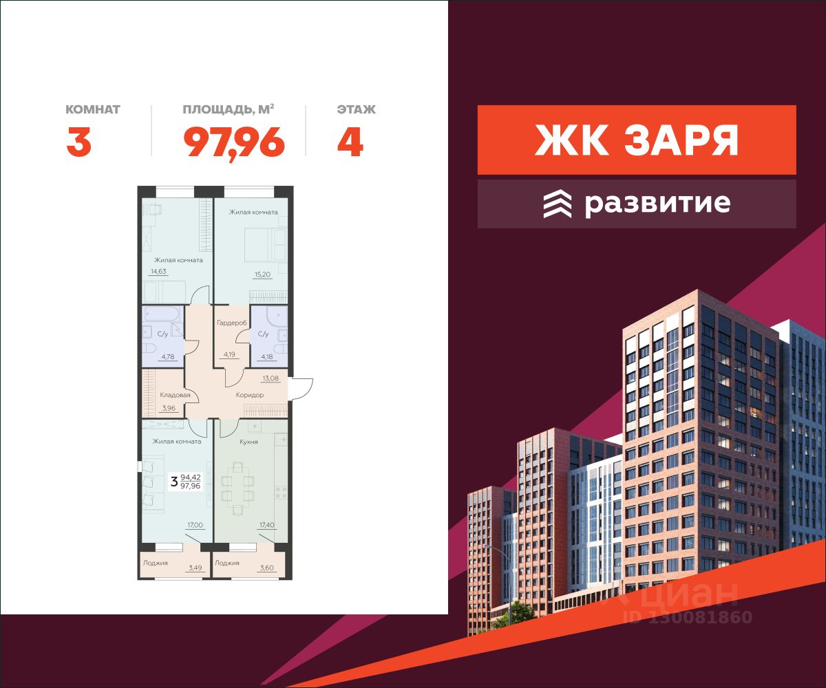 В продаже квартира площадью 97.96 кв. м с черновой отделкой. Квартира расположена на 4 этаже 10 этажного дома, в новом жилом комплексе "Заря" от федерального девелопера "Развитие".